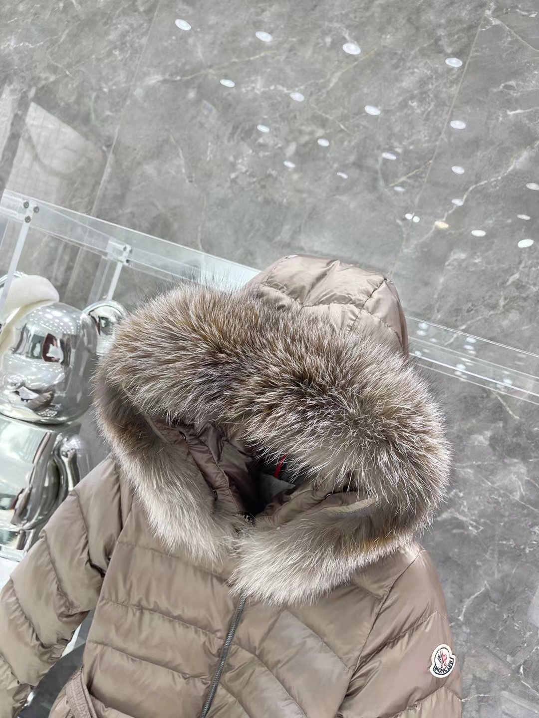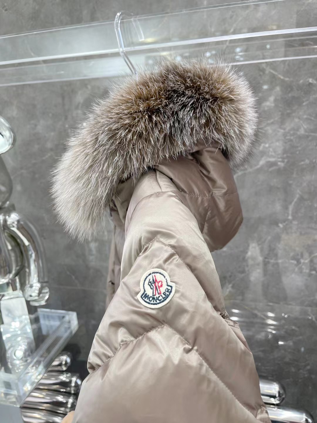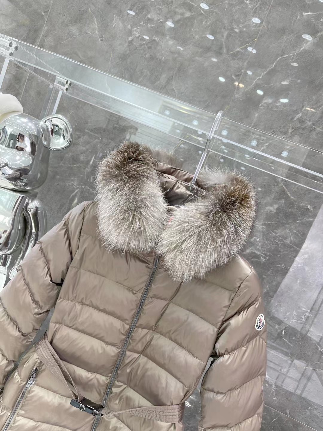 Moncler Women’s Long Down Jacket, Fur Hood Puffer Coat Champagne