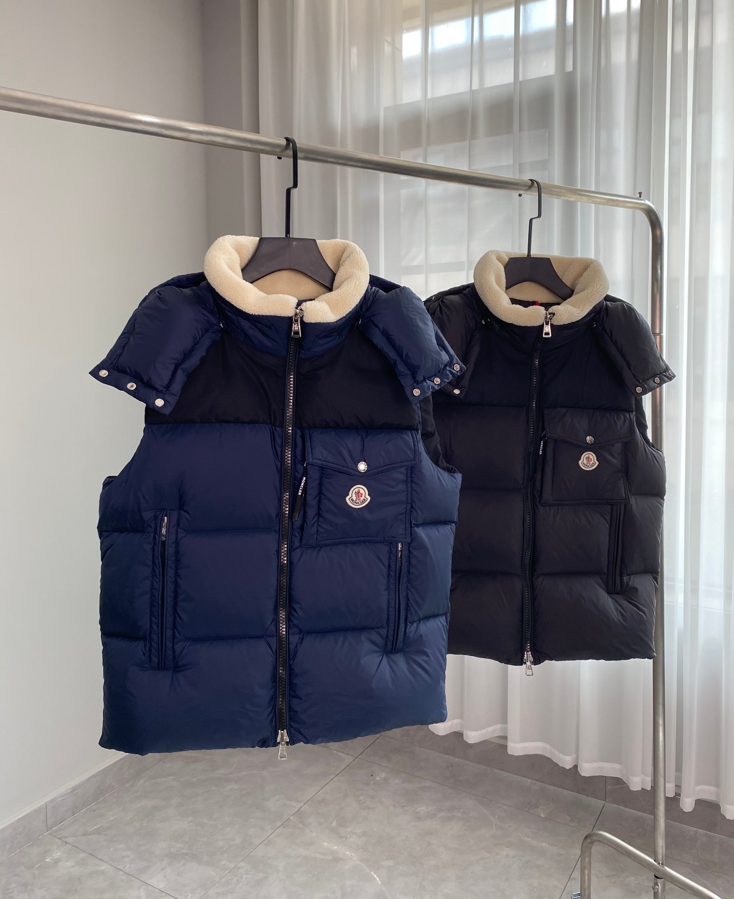 Moncler Men’s Casual Vest – Style 337, Original. Features a detachable hood and a warm shearling collar.