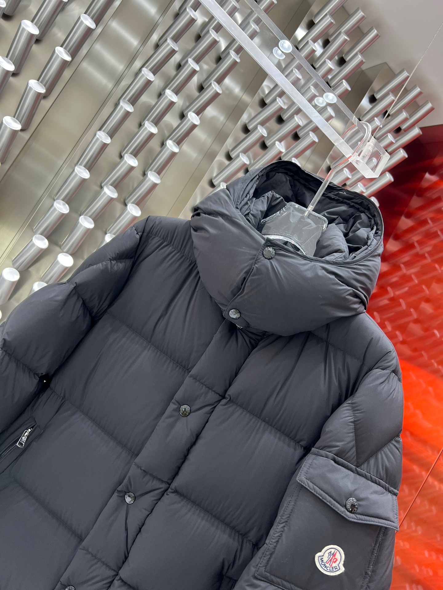 This long puffer jacket is made from premium longue saison fabric and is packed with functional details to ensure warmth and comfort. It features a detachable hood, zippered pockets, adjustable cuffs, and a snap-and-zip closure. The Moncler logo on the sleeve adds a distinctive touch, enhancing the overall style while significantly improving protection.