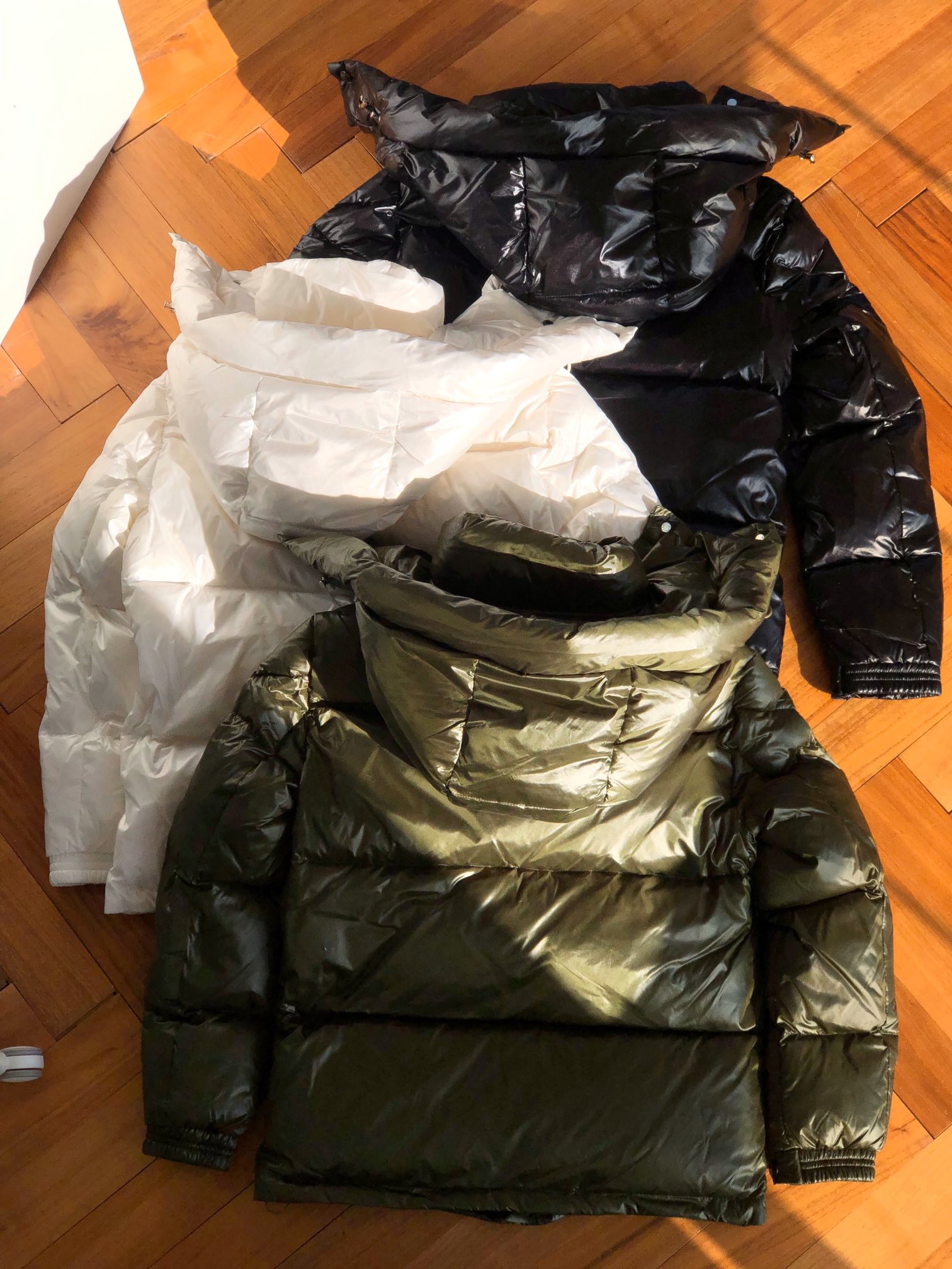 Introducing the Moncler Down Jacket, featuring a stylish double front zipper design and vibrant three-color woven straps. Available in Black, White, and Green, this jacket is a must-have for the winter season.