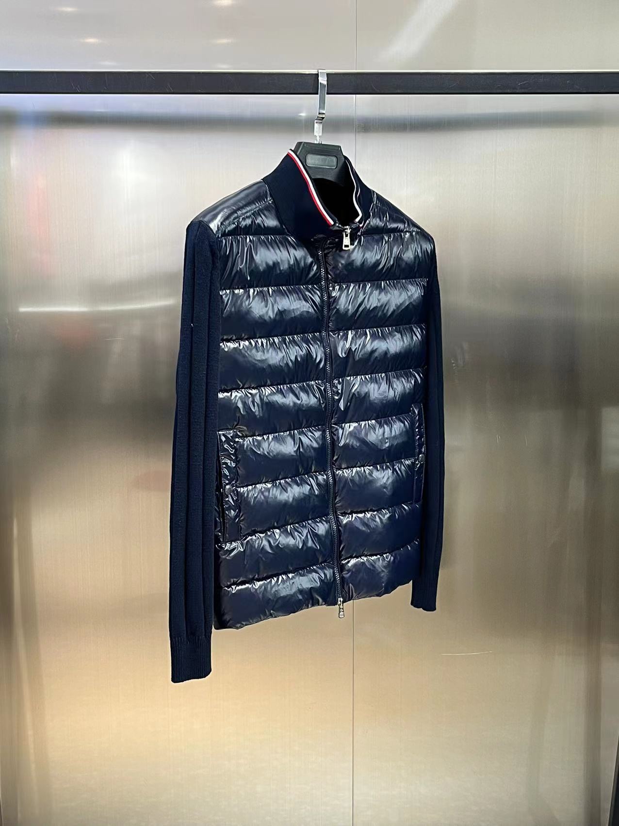 This Moncler piece features a stylish combination of down and knitted materials, with a stand-up collar and colorful striped accents. The knitted sections are crafted from a wool-blend fabric. Each year, Moncler releases several styles that blend knitwear with down, and these pieces have become classics in their collection, embodying a timeless, basic style. They can be worn alone or layered as a sweater, with black being the most popular color in-store.
