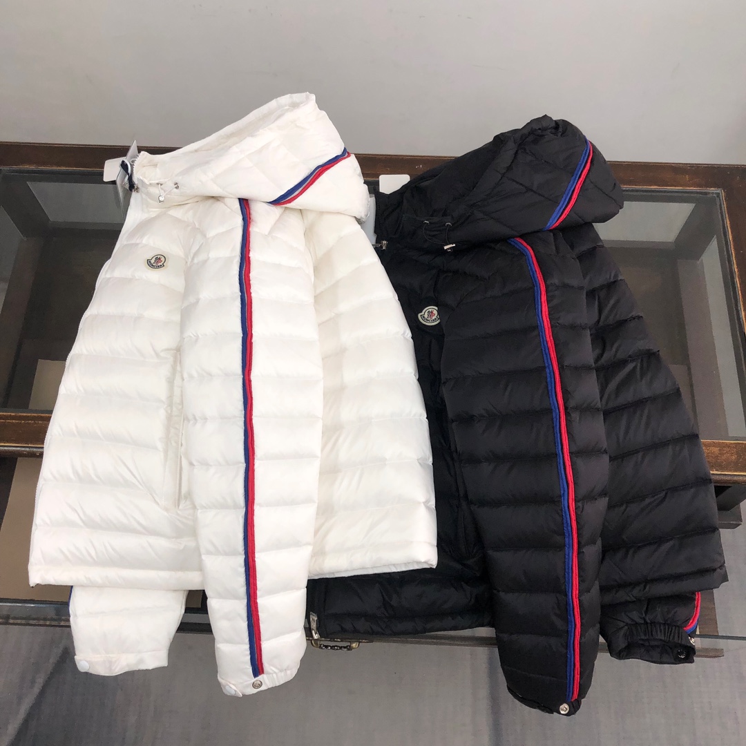 This stylish down jacket is crafted from windproof and waterproof fiber fabric, featuring a drawstring hood with the Moncler logo and zippered side pockets. The front has a two-way zipper for easy access, and the elastic cuffs are adjustable for a perfect fit. Filled with 90% white duck down, it offers exceptional loft and warmth, making it perfect for temperatures well below freezing.